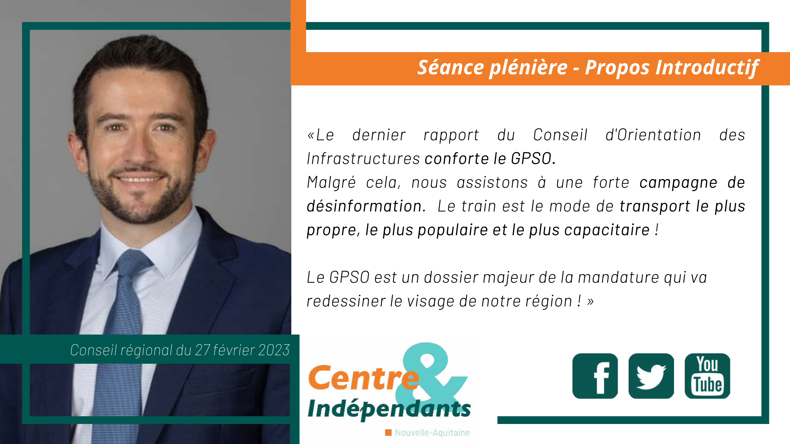 En guise de propos introductif à la séance plénière, Fabien Robert est intervenu pour réaffirmer le soutien du groupe Centre et Indépendants au Grand Projet du Sud-Ouest.